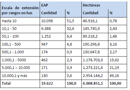 La radiografía actual de la concentración de las tierras en las EAP de mayor extensión, sin entrar a considerar la evolución de este proceso, es notable. El 84,1 % de las explotaciones son pequeñas y medianas de hasta 50 hectáreas, y ocupan sólo el 3,21% de la superficie total. En el otro extremo se ubican las explotaciones de más de 5.000 hectáreas, las que representan el 1,5% del total y concentran el 70,35% de la superficie.