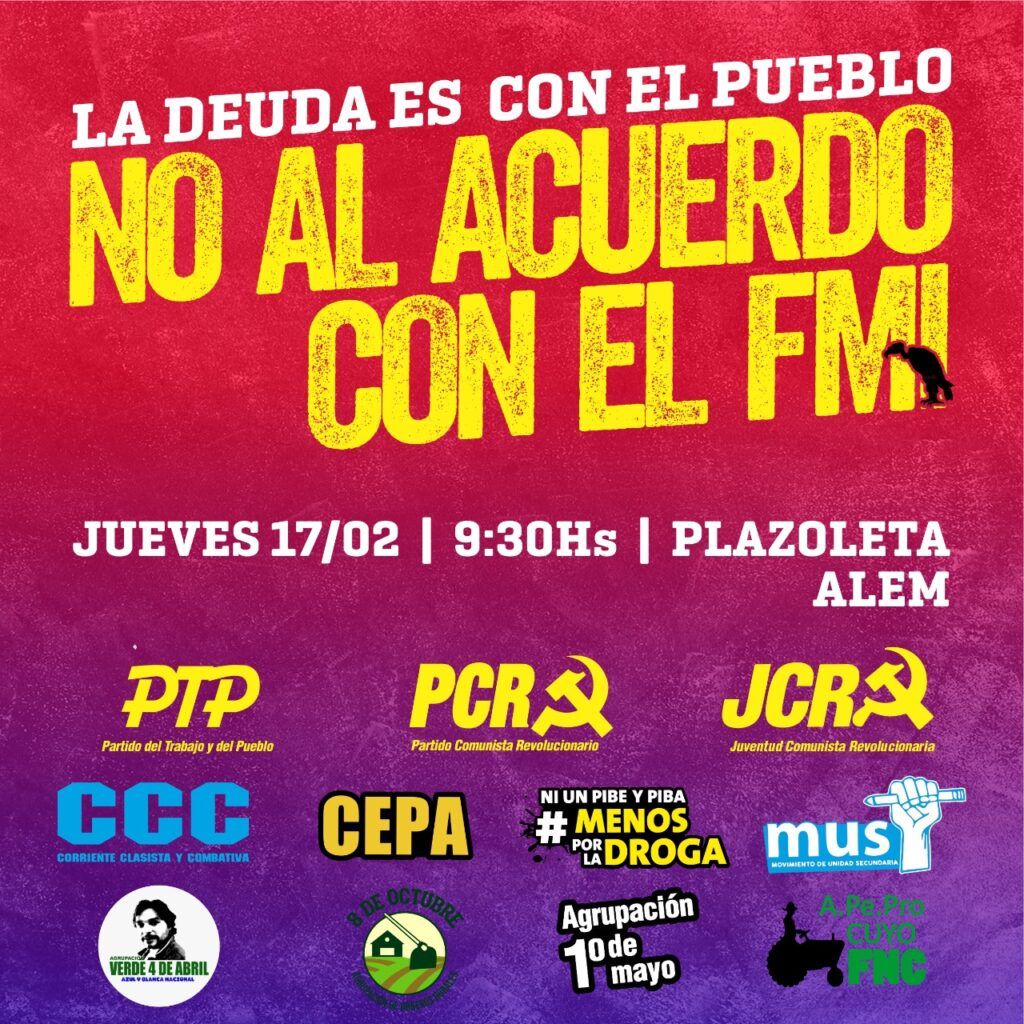 Las emergencias son muchas para nuestro pueblo y eso no puede quedar sin respuestas inmediatas. Sufrimos la pandemia, la inflación sigue hachando salarios, jubilaciones y asignaciones sociales, provocando más hambre y más pobreza. La tierra, el techo y trabajo aún son lo principal para resolver y debe ser lo primero a tener en cuenta y no las estafas que sumen al pueblo en mas miseria. Por eso proponemos 1) Investigar a dónde se fue hasta el último dólar del crédito concedido por el FMI al Gobierno de Cambiemos en el año 2018. 2) Mientras dure la investigación y con ello el recupero de gran parte del dinero fugado, suspender todo pago al FMI (en 2022 son 19.142 millones de dólares), priorizando los recursos en Trabajo, Educación y Salud para el pueblo. 3) Enjuiciar a los responsables políticos y económicos de esa estafa. CONVOCAMOS A MOVILIZAR EN TODA LA PROVINCIA CUANDO EL CONGRESO NACIONAL DE TRATAMIENTO AL ACUERDO CON EL FMI. Conferencia de prensa y movilización por las calles de Mendoza Jueves 17/2 a las 9.30hs. desde Alem y San Juan. PTP – SOBERANIA PUPULAR MENDOZA – UNIDAD POPULAR – PCR – JCR – CCC – Apepro Cuyo – MUS – CEPA- Ni un pibe menos por la droga – Agrup. Sindicales 8 de octubre – 1 de mayo – Agrupación Verde 4 de abril- Liberpueblo