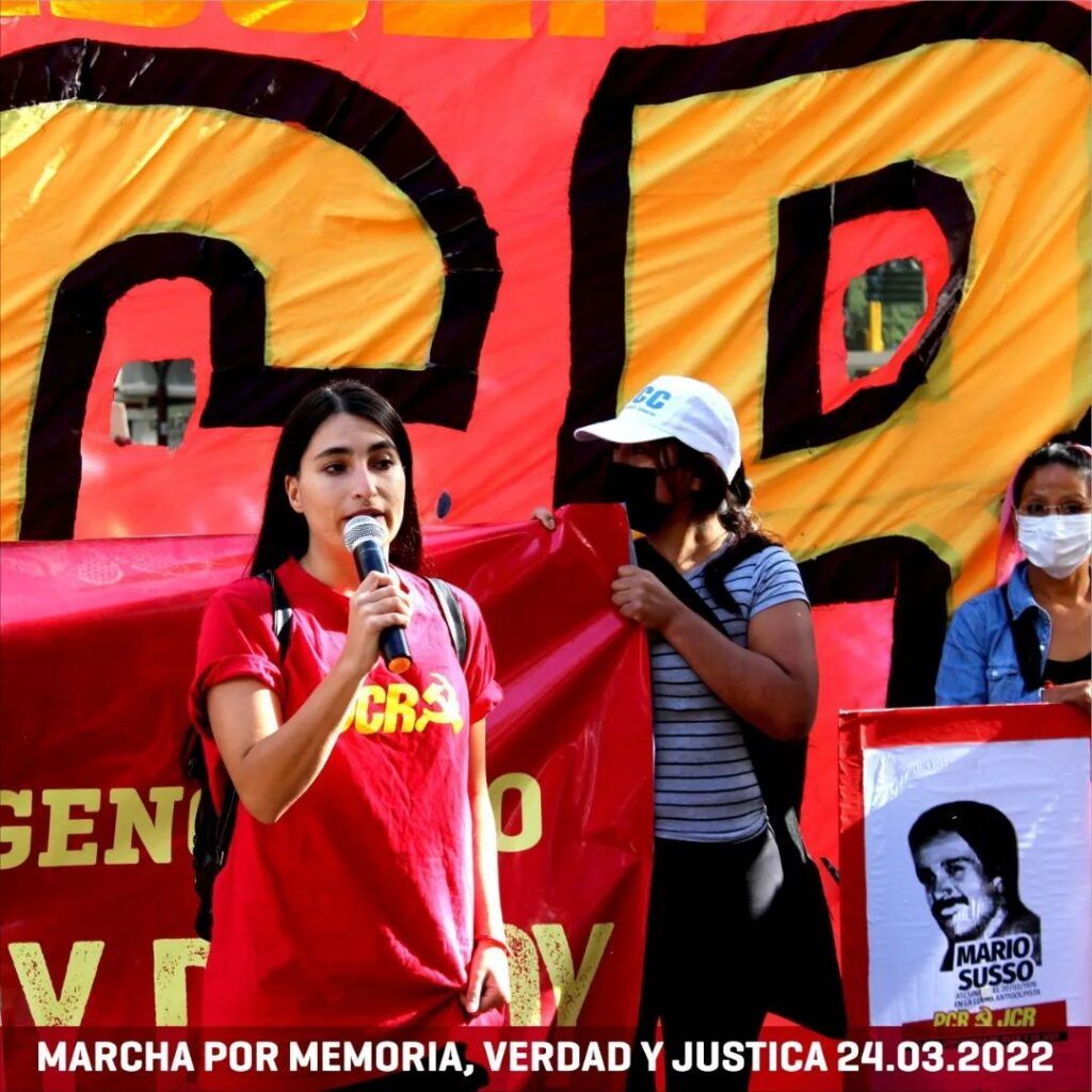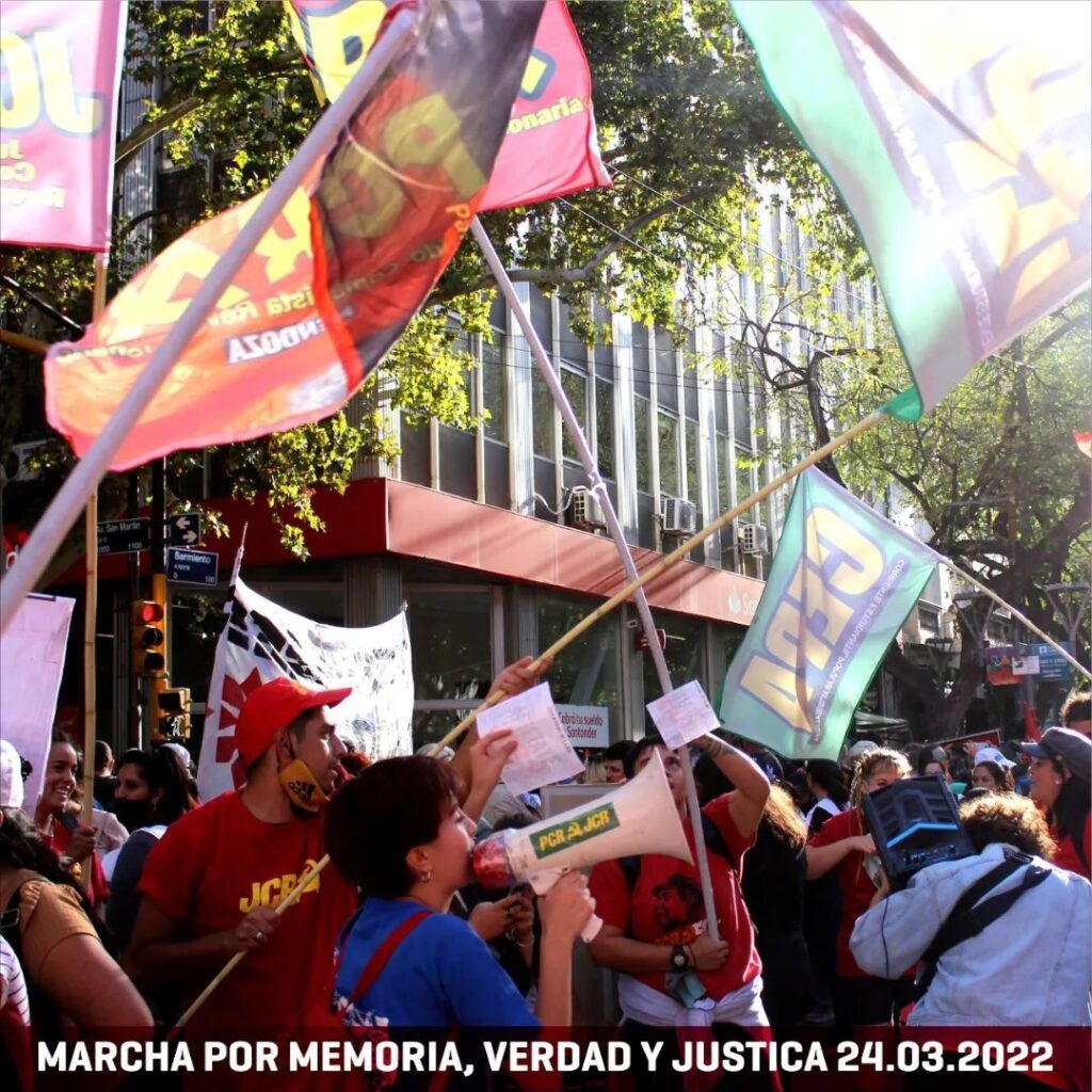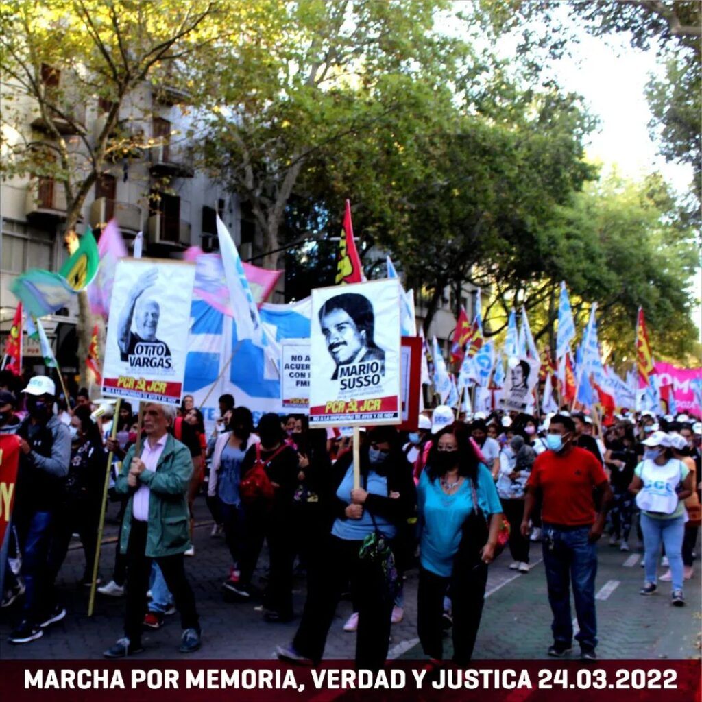 Cerca de las 17hs, organismos de derechos humanos, organizaciones sociales y políticas, se empezaban a concentrar para marchar. Desde el PCR-JCR Mendoza, junto a Liberpueblo, CCC , Apepro Cuyo, CEPA, MUS, organizaron un homenaje a Mario Susso, camarada asesinado el 20 de marzo del 1976 durante la lucha antigolpista. El acto fue antes de arrancar la marcha, en él hablo la Yes, la referenta de la agrupación estudiantil CEPA y le siguió el secretario zonal del PCR Facundo Guerra, quien marcó la importancia de homenajear a Mario: «…Mario fue dirigente estudiantil de la UTN y el PCR, luchó por la liberación del pueblo y denunció activamente los preparativos golpistas. Él, observaba con preocupación la situación social y política del país y, como tantos miles de jóvenes, buscaba el camino más justo para encauzar esas inquietudes «…