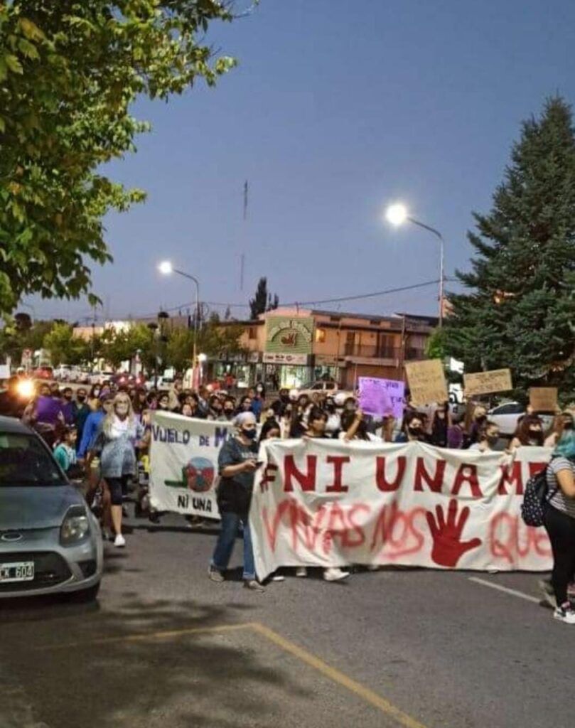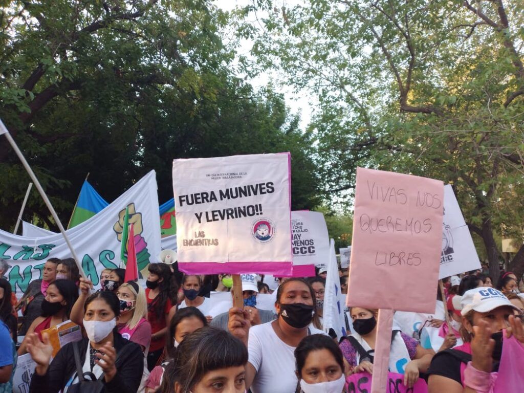 En varias pancartas se pudo leer: Ni olvido Ni perdón a los Femicidios- Ma… sino vuelvo quema todo- Fuera Munives y Levrino- Emergencia en violencia ya!!- Tierra Techo y Trabajo para las Mujeres Campesinas, etc…